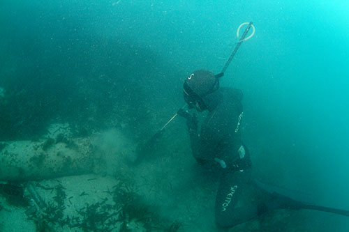 en la siguiente imagen, Samuel Tomas extrae un congrio del tubo de un emisario.