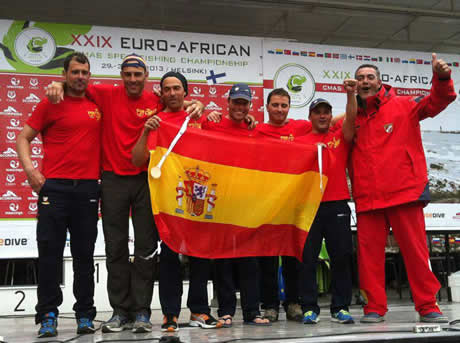 El equipo español lo ha vuelto a conseguir. Después de ganar hace dos años en Peniche, España ha revalidado el título por equipos del Campeonato de Euro-África de pesca submarina. Y no ha sido fácil, ya que el campeonato se ha disputado en Helsinki, Finlandia, en unas aguas muy difíciles, extremadamente sucias y frías, con temperaturas del agua incluso inferiores a los 10º.